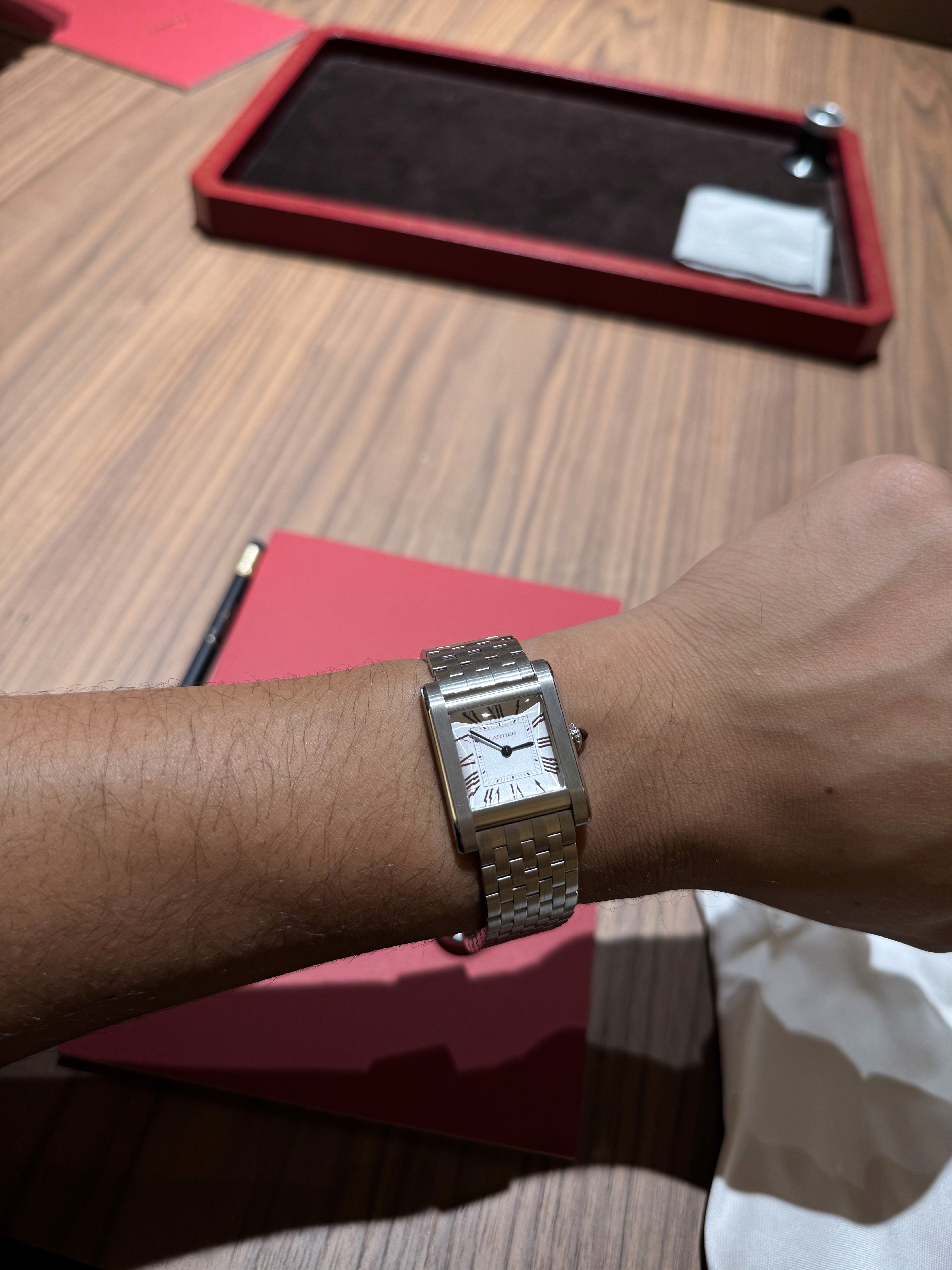 Releitura de um dos formatos mais clássicos da Cartier, agora em platina. Mantém o desenho original do Tank, com proporções retas e leitura minimalista, mas eleva o material e o acabamento. Funciona mais como reafirmação histórica do que como inovação.